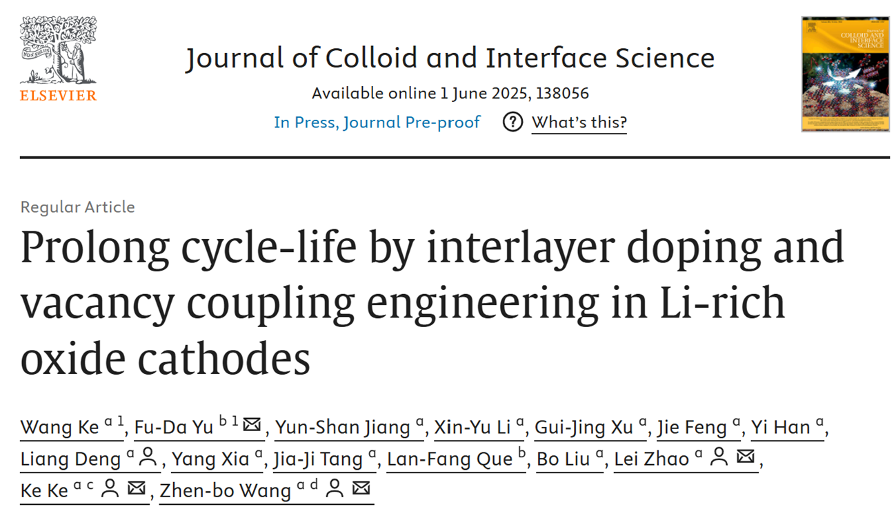 近日,国家级专家、教授级高级工程师、哈尔滨工业大学校外兼职博士生导师、河南克能新能源科技有限公司创始人柯克博士与哈工大王振波教授联合指导的博士研究生Ke Wang为第一作者的研究成果在国际顶尖学术期刊Journal of Colloid And Interface Science(JCIS,《胶体与界面科学》)以题名“Prolong cycle-life by interlayer doping and vacancy coupling engineering in Li-rich oxide cathodes”(层间掺杂及空位耦合工程延长富锂氧化物正极循环寿命)发表。