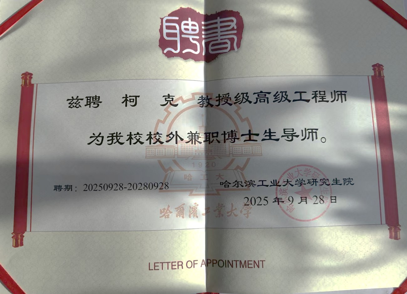 近日,河南克能新能源科技有限公司董事长柯克博士再次被哈尔滨工业大学研究生院续聘为校外兼职博士生导师。